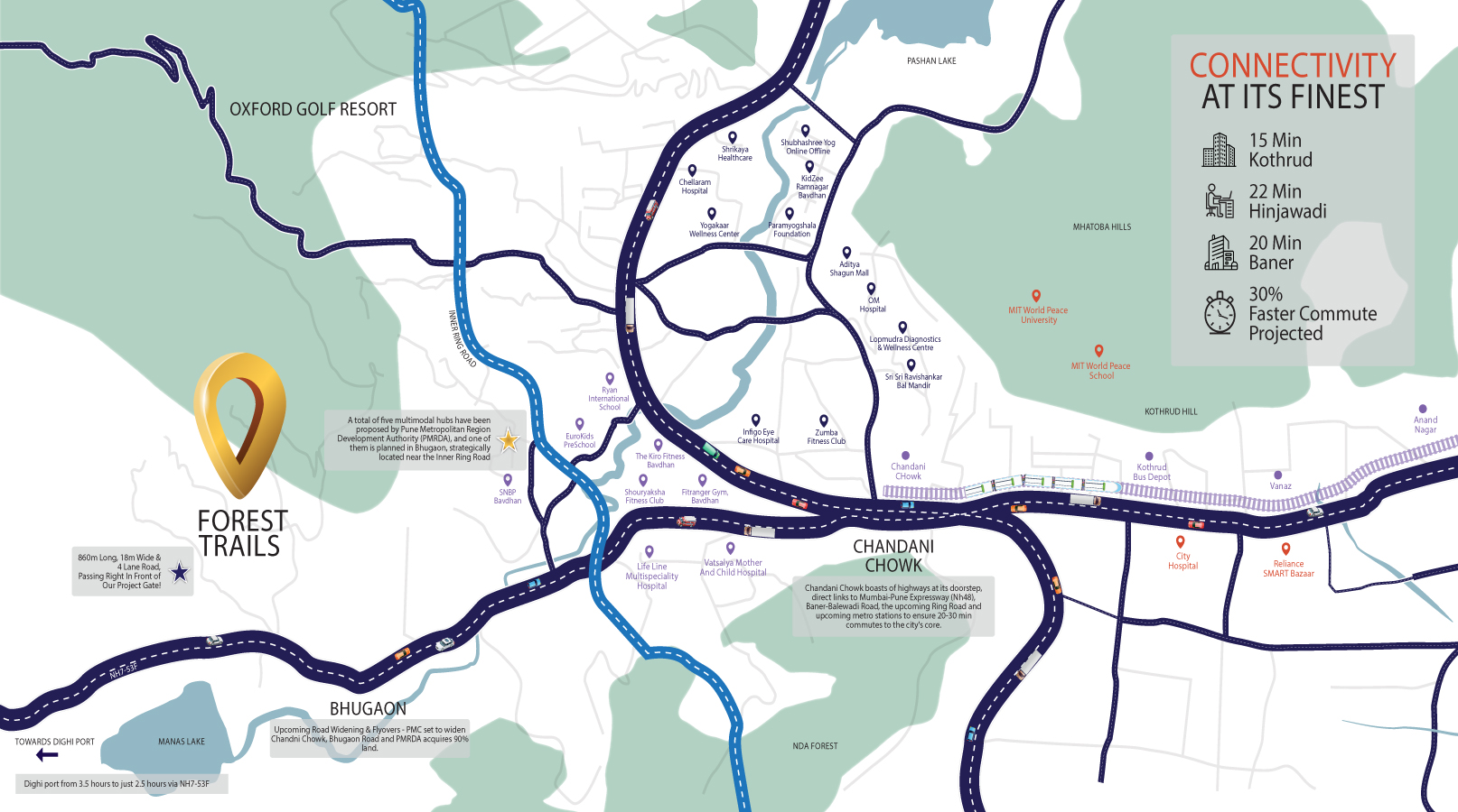 Bhugaon's placement on Pune's western arc allows daily life to follow an efficient loop. Being on Paud Road means direct access to the city's most active work corridors. The geography creates visual openness, cleaner air channels and natural light paths that benefit every home built within this belt. Growth is structured through planned township clusters ensuring the corridor remains spacious, organised and breathable even as it scales. This makes the location intelligently sized for future population and lifestyle expansion without losing its core advantage of calm & connected everyday living.